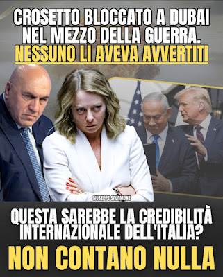 Meglio dello schiavo. L'ennesima guerra, con durata e dimensioni ancora indefinibili, mostra senza dubbi, il nostro ruolo di servi della gleba occidentale. Il duo Trump&Netan nel festival bellico canta e bombarda assieme. La scusa è l'armamento nucleare del nemico iraniano, per caso, altro paese fortemente dotato di petrolio. Forse per Netan non è la ragione preponderante, mentre per il Tycoon ed i 27 psichiatri che lo hanno giudicato è sufficiente. Crosetto era rimasto bloccato a Dubai. La nostra Ducetta non si è mossa. Dal Pd nessun vagito, chiederanno di sentire il racconto della Meloni. L'Iran proclama 40 giorni di lutto ed annuncia chi sostituirà Khamanei, magari più duramente. Difficile per Israele aumentare in quella direzione il numero delle colonie. E' stato un colpo con inevitabile risposta che la nostra Europa ha dovuto ingoiare senza avvertimenti. Segnale utile per stabilire il nostro peso ed importanza nello scacchiere che conta. Mentre gli attuali 27 paesi europei, con il via vai del Regno Unito, sono divisi su quasi tutto. L'Iran proclama 40 giorni di lutto ed assesta colpi pesanti in risposta. Impossibile per il duo bellico in azione condurre a lungo una guerra di questo tipo. Un errore molto simile a quello di Putin. Intanto l'Iran ha chiuso lo Stretto di Hormuz, la rotta petrolifera più importante. Lo potete vedere già nel veloce aumento di benzina e gas. I nostri partiti (quasi tutti) sono silenziosi in attesa di ordini Supremi.